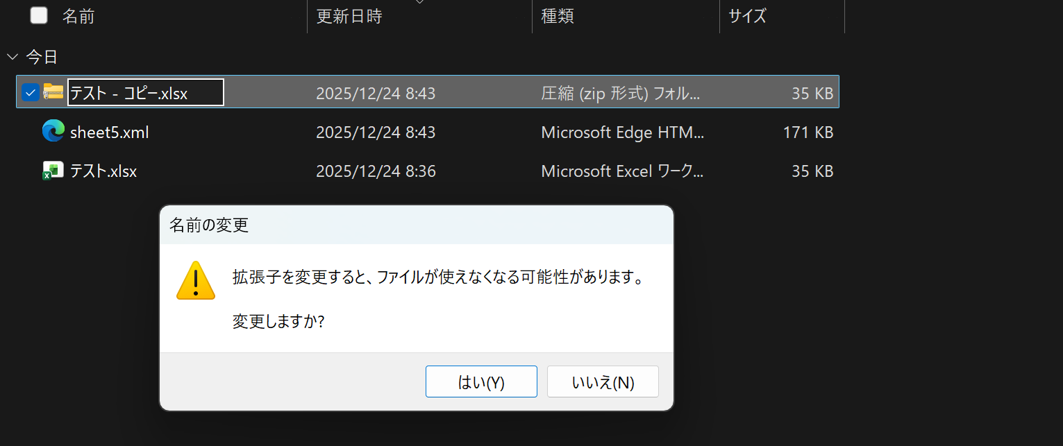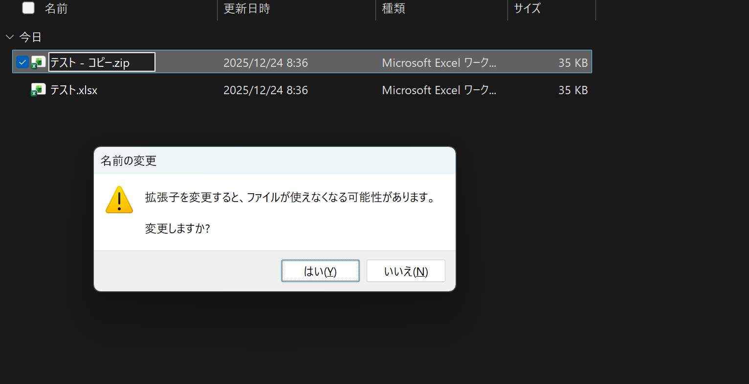 ⑥拡張子を.zipから.xlsxに戻します。確認メッセージが表示されますが、「はい」で進んで問題ありません。