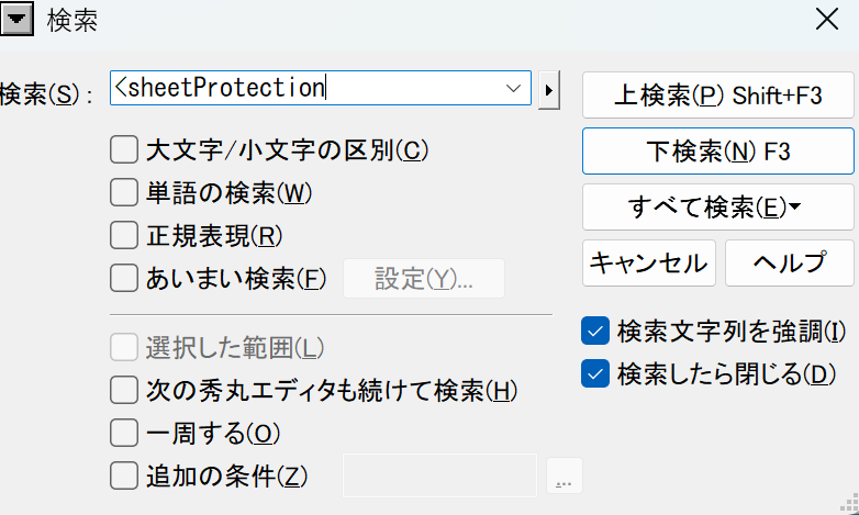 ②次に検索ウィンドウで、以下を入力して、該当行を探します。